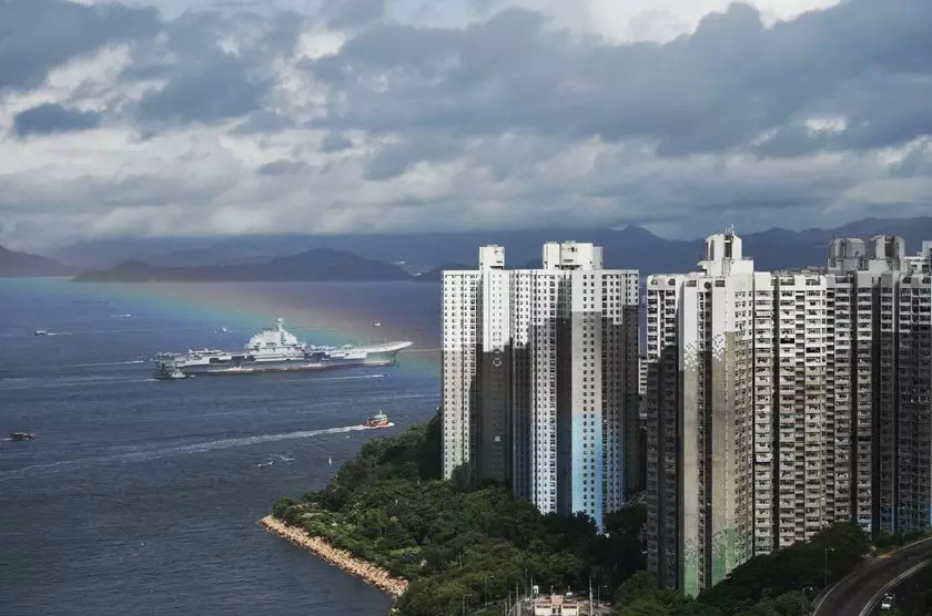 2017年7月7日,海軍遼寧艦在香港南丫島附近航行。當日,正在執行跨區機動訓練任務的中國人民解放軍海軍航母編隊抵達香港,參加香港回歸祖國暨中國人民解放軍進駐香港20周年慶?;顒樱艿较愀厶貐^政府和民眾熱烈歡迎。 新華社發(王申攝)