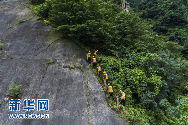 “蜘蛛俠”們穿過雜樹叢爬上陡坡準備作業。新華網 王頔攝