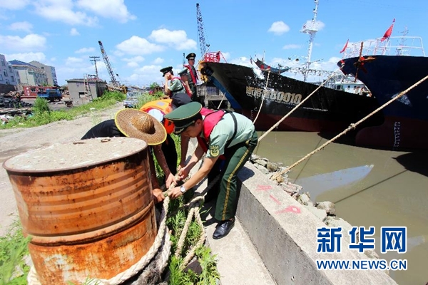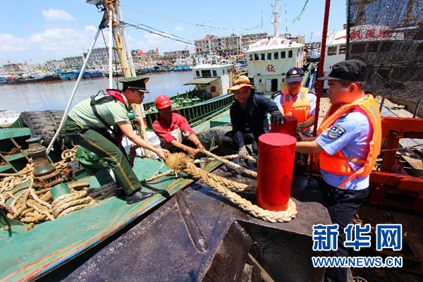 7月10日,在浙江省臺州市路橋區(qū)金清港,公安民警與邊防官兵聯(lián)合巡邏,幫助漁民做好漁船防風加固。新華社發(fā)(蔣友親 攝)