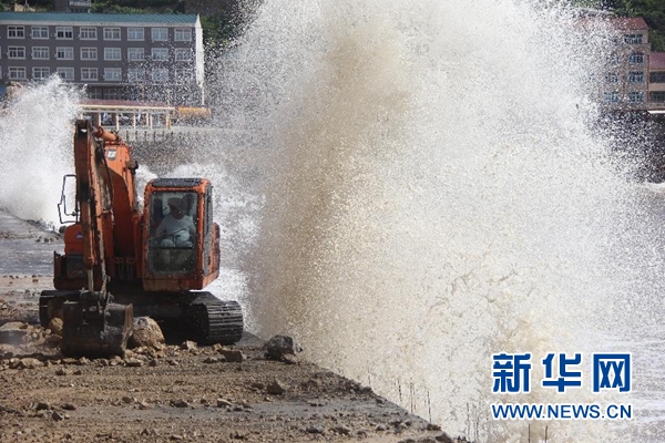 7月10日,在浙江省溫嶺市石塘鎮(zhèn)金沙灘,景區(qū)工作人員在進行加固堤壩作業(yè)。新華社發(fā)(金云國 攝)