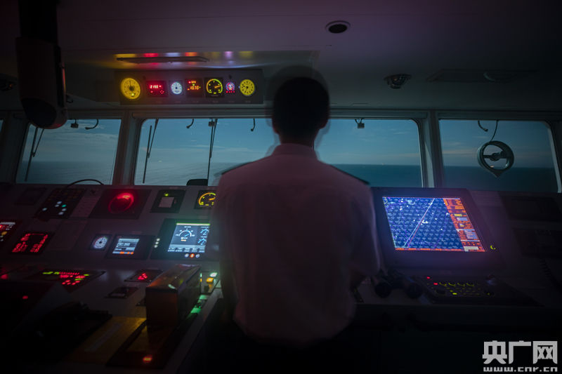 “也是為了防范電子設(shè)備出現(xiàn)意外嘛。”除了各類儀表的光,駕駛臺(tái)里幾乎是漆黑一片。趕在天黑前,三副身后的黑色幕簾被死死拉嚴(yán),沒留一點(diǎn)縫隙。