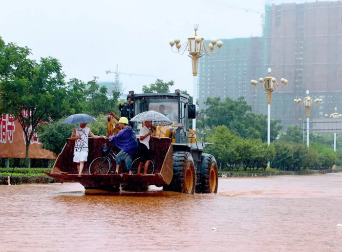 7月6日,江西省撫州市東鄉(xiāng)區(qū)部分道路積水嚴(yán)重,市民乘坐鏟車通過積水路段 何江華攝