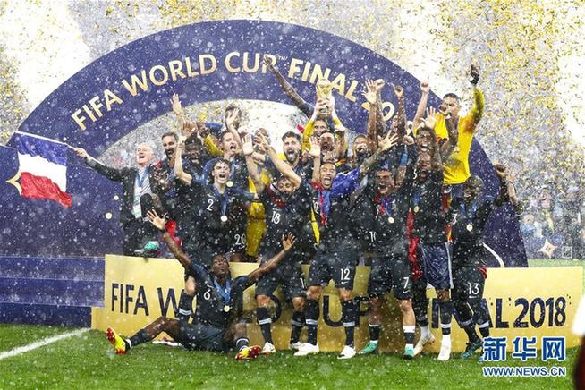 圖為2018年7月15日,在莫斯科進(jìn)行的2018俄羅斯世界杯足球賽決賽中,法國隊(duì)球員在頒獎儀式上慶祝。法國隊(duì)以4比2戰(zhàn)勝克羅地亞隊(duì),繼1998年后再奪世界杯冠軍。新華社記者曹燦 攝