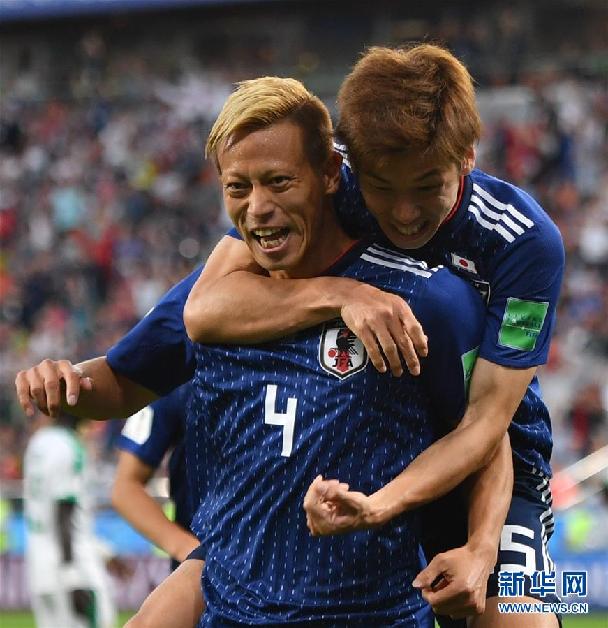 圖為2018年6月24日,在葉卡捷琳堡進(jìn)行的2018俄羅斯世界杯足球賽H組小組賽日本隊(duì)對陣塞內(nèi)加爾隊(duì)的比賽中,日本隊(duì)球員本田圭佑(左)在進(jìn)球后慶祝。最終,日本隊(duì)以2比2戰(zhàn)平塞內(nèi)加爾隊(duì)。新華社記者劉大偉 攝