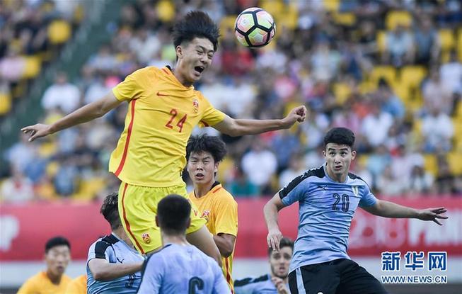 圖為2018年5月27日,在四川成都舉行的2018“熊貓杯”國際青年足球錦標(biāo)賽中國U19國家青年隊(duì)對陣烏拉圭U19國家青年隊(duì)的比賽中,中國隊(duì)球員蔣圣龍(上)在比賽中爭頂。最終,中國U19國家青年隊(duì)以3比1戰(zhàn)勝烏拉圭U19國家青年隊(duì)。新華社記者薛玉斌 攝