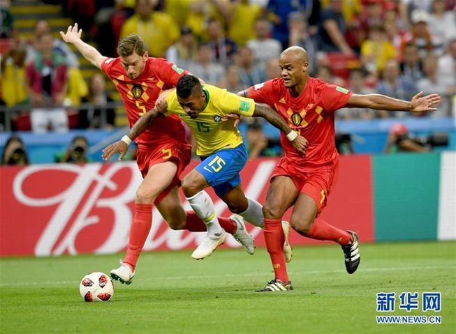 圖為2018年7月6日,在喀山進(jìn)行的2018俄羅斯世界杯足球賽四分之一決賽中,巴西隊(duì)球員保利尼奧(中)與比利時隊(duì)球員維爾通亨(左)、孔帕尼在比賽中拼搶。巴西隊(duì)以1比2不敵比利時隊(duì),無緣四強(qiáng)。新華社記者杜宇 攝