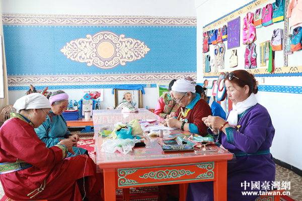 薩仁格日勒(右三)與朋友們縫制民族服飾。(中國臺灣網(wǎng) 李寧 攝)
