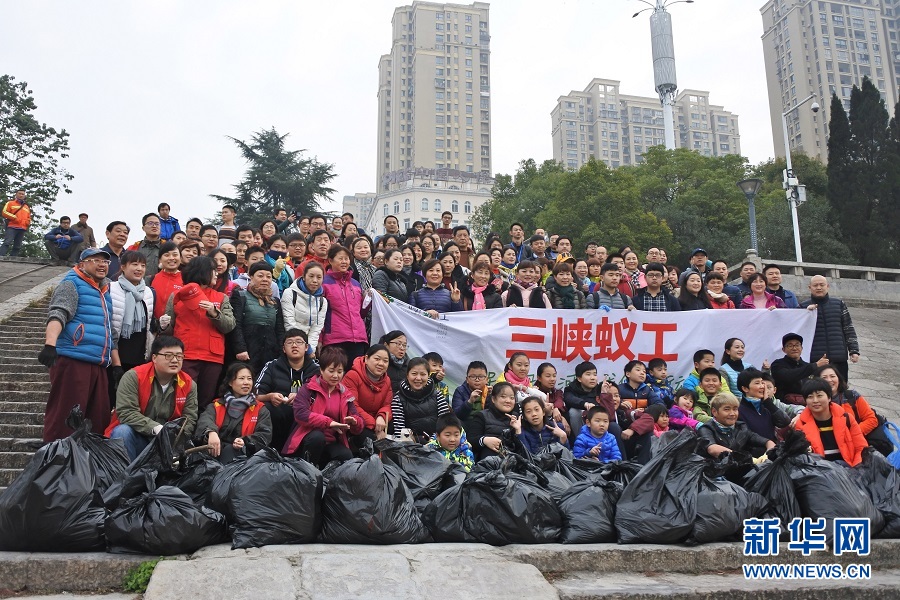 2016年12月3日,“三峽蟻工”志愿者在撿拾的垃圾前合影。2016年10月,在李年邦的發(fā)起下,“三峽蟻工”志愿者組織正式成立,300多名固定成員成為長江垃圾清理的主力軍,他們以“保護長江母親河”為口號,每逢周末和法定節(jié)假日都會自發(fā)組織在長江岸邊撿拾垃圾。 新華社記者 王自宸 攝