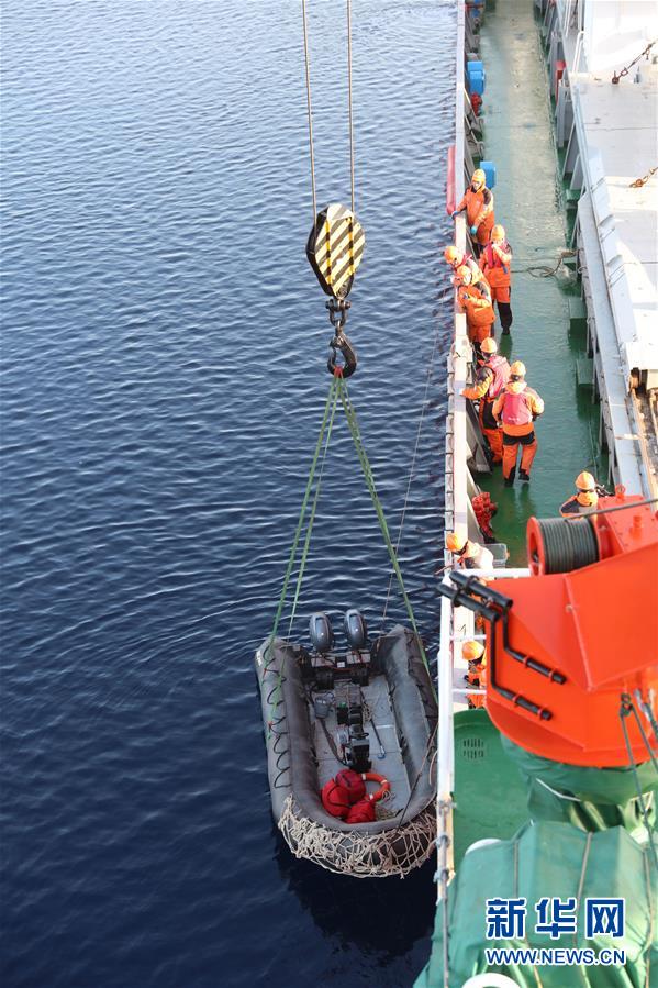 回收浮球的橡皮艇準備就位。長長的懸梯從“雪龍”號上放下,5名考察隊員依次下到橡皮艇上,頂著凜冽海風直奔浮球處。“撈球”工作進展得十分順利,不久,橡皮艇就拖著鮮艷的浮球由遠及近駛向“雪龍”號的后甲板作業區。潛標被成功收回,相關考察隊員隨即對潛標開展維護和數據采集工作。