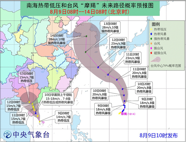 今年第14號臺風“摩羯”昨天在臺灣以東洋面生成。預計“摩羯”將于11日夜間進入東海東部海面,之后在我國東部海區北上,強度逐漸加強到強熱帶風暴級(10~11級,25~30米/秒)。12日至14日,東海北部、黃海將先后出現7~9級大風,臺風中心經過的海域風力有10~11級、陣風12~13級。