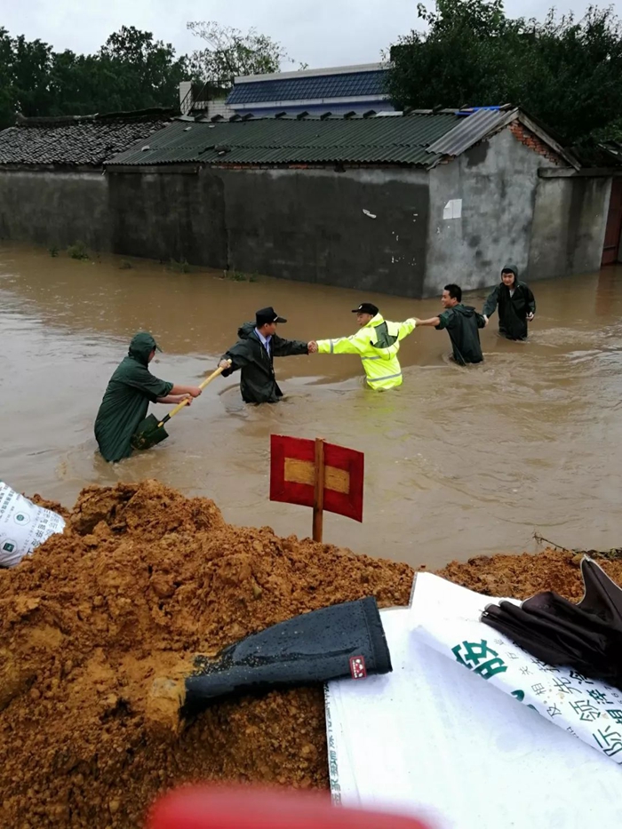 2018年7月2日,眉山市公安局園區分局象耳派出所民警在暴雨后搶險疏散群眾。