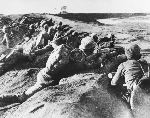 1937年抗日戰(zhàn)爭全面爆發(fā)后,中國共產黨在南方八省的紅軍及游擊隊改編為國民革命軍陸軍新編第四軍(簡稱新四軍)。這是1938年11月3日,新四軍戰(zhàn)士在馬家園戰(zhàn)斗中打擊敵人。新華社發(fā)