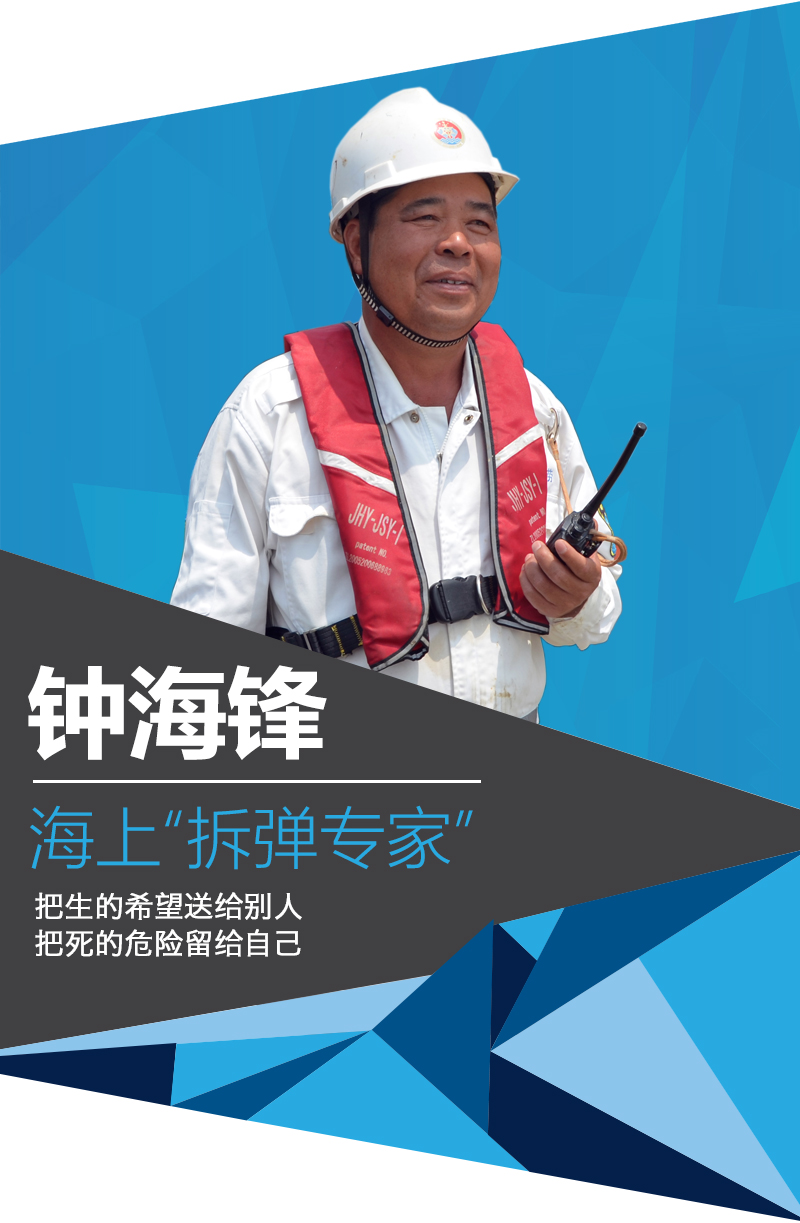 一次海上施工,需要潛水尋找放入的鋼管。隊(duì)員鐘佛軍在水下連續(xù)摸找了一個(gè)小時(shí),仍舊一無所獲。通過水下電話,焦急的鐘佛軍跟岸上的鐘海鋒告知了情況。鐘海鋒立刻下水摸找鋼管,不到十分鐘,就成功找到目標(biāo)。