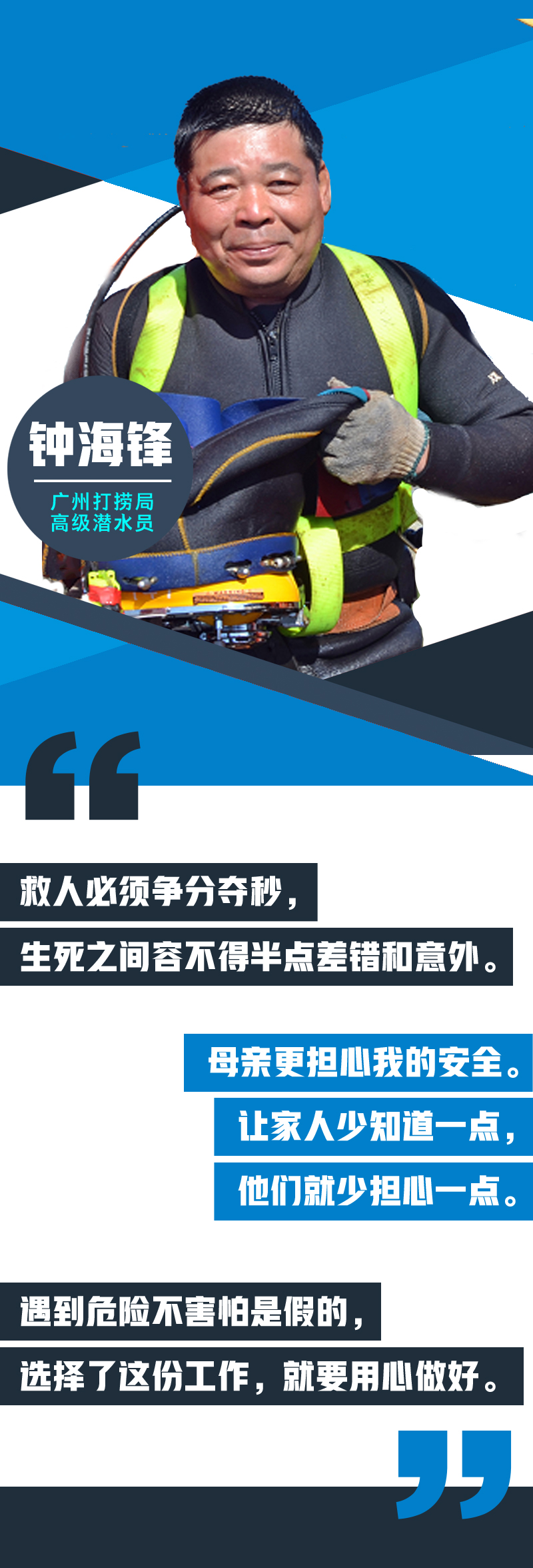 鐘海鋒是廣州打撈局高級(jí)潛水員。28年間,救人和打撈工作布滿了他的職業(yè)履歷。在他的手中,命懸一線的生命重獲生機(jī),千噸級(jí)的沉船重見天日。