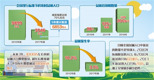 在以習(xí)近平同志為核心的黨中央堅(jiān)強(qiáng)領(lǐng)導(dǎo)下,脫貧攻堅(jiān)力度之大、規(guī)模之廣、影響之深前所未有。經(jīng)過幾年的努力,脫貧攻堅(jiān)取得決定性進(jìn)展:全國現(xiàn)行標(biāo)準(zhǔn)下的農(nóng)村貧困人口由2012年底的9899萬人,減少到2017年底的3046萬人,5年累計(jì)脫貧6853萬人,減貧幅度達(dá)到70%左右。貧困發(fā)生率由2012年底的10.2%下降到2017年底的3.1%。貧困縣數(shù)量實(shí)現(xiàn)了首次減少,2016年有28個(gè)貧困縣脫貧摘帽,2017年有125個(gè)貧困縣申請摘帽,今年計(jì)劃200多個(gè)縣摘帽,解決區(qū)域性整體貧困邁出堅(jiān)實(shí)步伐。貧困地區(qū)群眾生產(chǎn)生活條件明顯改善,貧困群眾收入水平明顯提高、獲得感明顯增強(qiáng)。