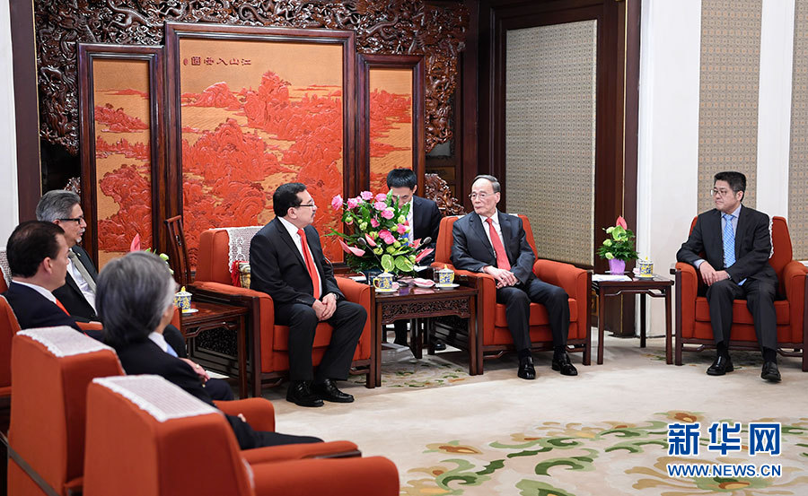 8月21日,國家副主席王岐山在北京中南海會見薩爾瓦多代理總統職務第一指定人岡薩雷斯、總統法律秘書阿爾瓦拉多、外長卡斯塔內達。 新華社記者 張領 攝
