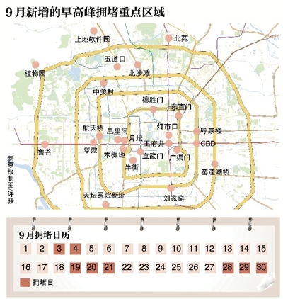 受9月開學的影響,新增的早高峰擁堵重點區域及路段主要圍繞在學校周邊,預計會有十幾個熱點區域,7點到7點40的上學早高峰時段,建議盡量避開這些地區繞行,具體區域包括:東城區的燈市口、王府井、廣渠門、東直門;西城區的月壇、三里河、宣武門、牛街地區、德勝門地區;朝陽區的CBD、呼家樓、北苑、北沙灘;海淀區的中關村、航天橋和翠微;豐臺區的劉家窯地區;石景山區的魯谷等。