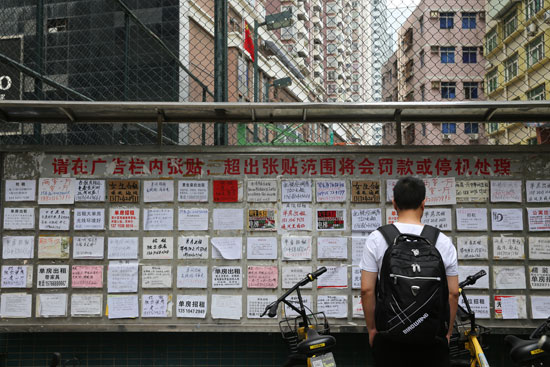 深圳市福田區崗廈村中的公告欄上貼滿了各種招租求租信息,一層層覆蓋著,圖為一位白領模樣的年輕人在看租房信息,崗廈村里像他這樣的白領還有很多,他們大都在附近的寫字樓里上班。這個位于深圳市中心的城中村房東靠房租可以月入10萬元,白領花千元只能租個床位。視覺中國供圖