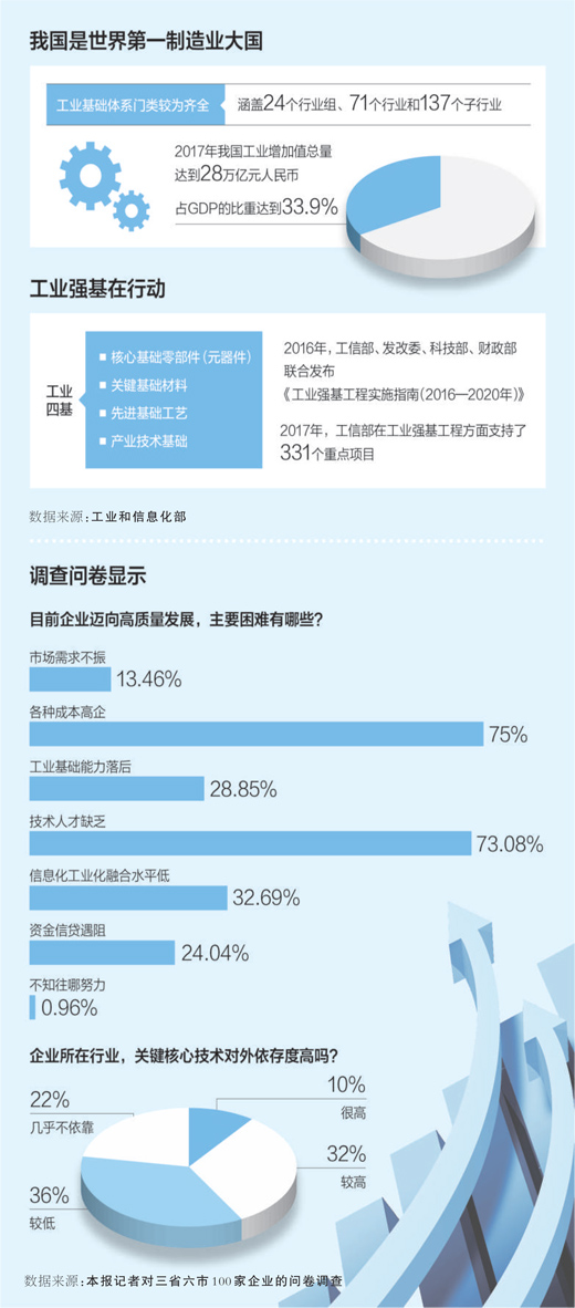 “要實現從‘有’到‘好’的轉變,在高端產品上突破,還需要時間。”調查中企業坦言,我國部分核心技術、關鍵產品和重大裝備仍存瓶頸制約,一些工業產品在一致性、穩定性和使用壽命方面與國外先進水平差距較大,工業基礎須進一步夯實。