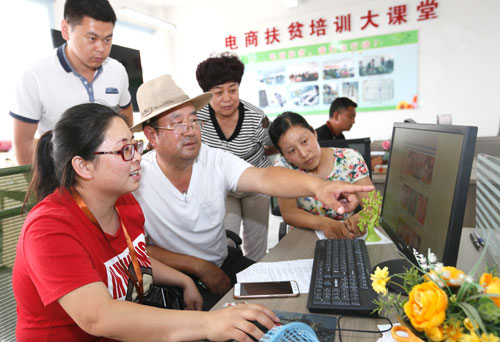 電商培訓中心工作人員(前左)在指導貧困戶通過網絡銷售農產品