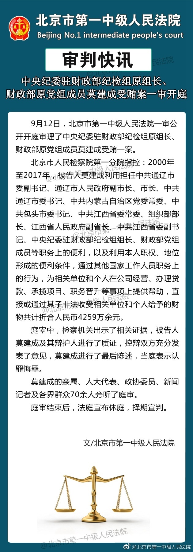 據北京市第一中級人民法院官方微博消息,9月12日,北京市第一中級人民法院一審公開開庭審理了中央紀委駐財政部紀檢組原組長、財政部原黨組成員莫建成受賄一案。