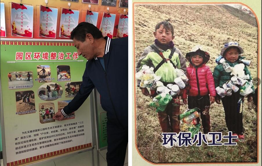 圖左為昂塞鄉鄉長旦增文秀向記者介紹“垃圾換文具”活動,圖右為學校評選出的“環保小衛士”。人民網記者 余璐攝