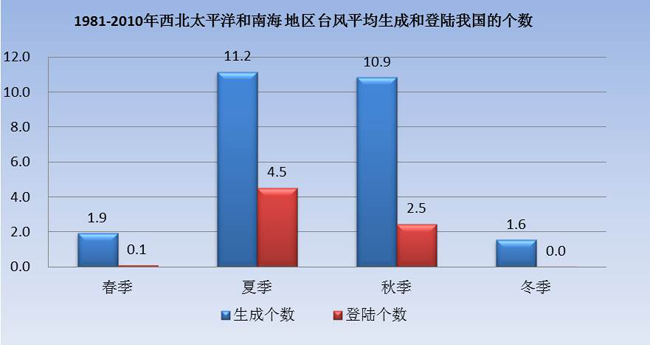 圖1 1981-2010年西北太平洋和南海臺風平均生成和登陸我國個數 李慧 制圖