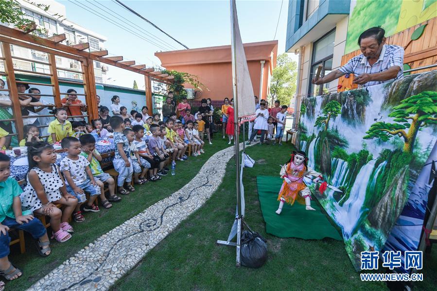 長興縣71歲的提線木偶藝人蔣晚寶在給孩子們表演提線木偶劇“哪吒鬧海”