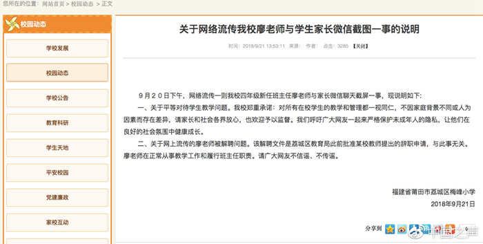 下午,涉事的莆田市荔城區梅峰小學在其官方網站發布消息,該解聘文件是荔城區教育局此前批準某校教師提出的辭職申請,與此事無關。廖老師在正常從事教學工作和履行班主任職責。