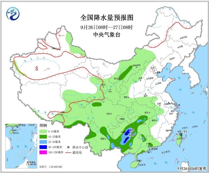 9月26日08時至27日08時,西北地區中東部、內蒙古中西部、華北北部、黃淮西部、江淮西部、江漢、江南中西部、華南、西南地區及臺灣島等地的部分地區有小到中雨,其中,貴州東南部、廣西西北部等地有大到暴雨,局地有大暴雨(100~110毫米);新疆北部、內蒙古西部等地有4~6級風(見圖1)。東海大部海域、臺灣海峽、臺灣以東洋面、巴士海峽、南海東北部海域將有7~8級、陣風9~10級的大風。