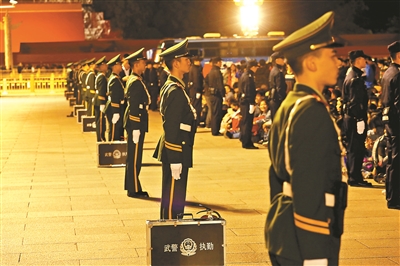 王帥把鬧鈴定到了凌晨0:00,鬧鈴一響,他立刻起身,穿好執勤衣服,0:30準時到達哨位。他執勤的地方,就在國旗區護欄外。此時,廣場的圍欄外已經聚集了很多游客,時針指向1:15,廣場圍欄打開,游客們一窩蜂涌過來。為了防止擁擠、踩踏事件的發生,圍欄內的武警戰士們40余人一組,在國旗區四周圍成“口”字型的人墻,有序引導游客們走進“人墻”內,等待升旗儀式的開始。