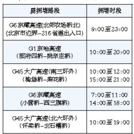 預計今早7點,G6京藏高速(小營橋-西三旗橋)將最早進入擁堵狀態。G6京藏高速(北郊農場橋北) (北京市邊界-216省道出入口)從早9點進入擁堵狀態,擁堵高峰將持續至23時。京哈高速在早10點進入擁堵狀態,擁堵將持續至20時。