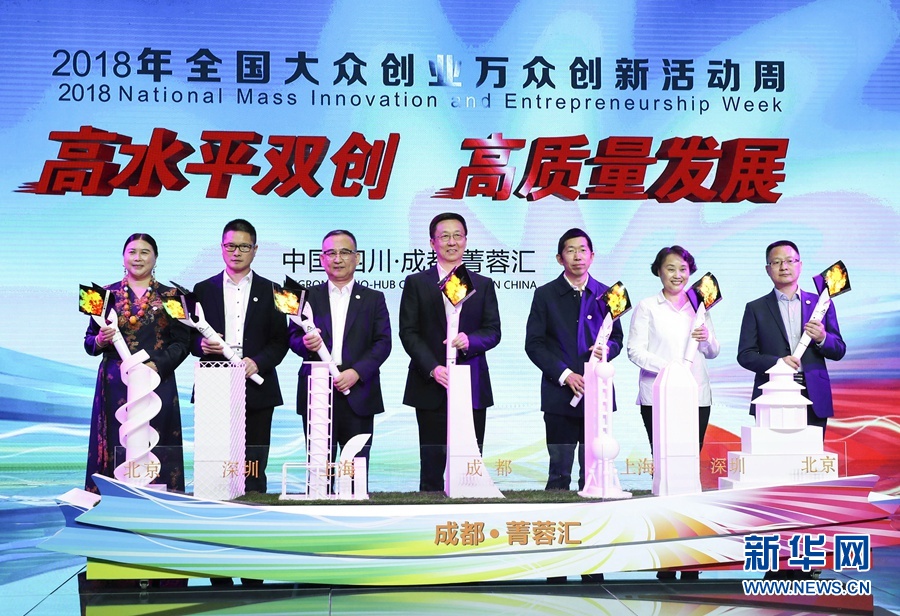 10月9日,2018年全國大眾創業萬眾創新活動周在四川成都拉開帷幕。中共中央政治局常委、國務院副總理韓正出席啟動儀式并講話。這是在啟動儀式上,韓正與創新創業者代表共同啟動活動周。 新華社記者 龐興雷 攝