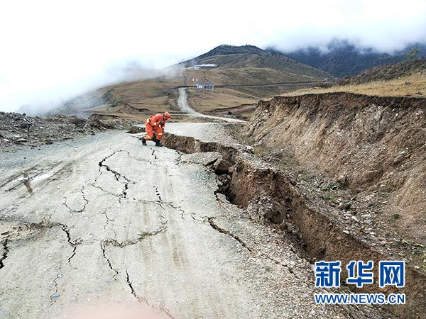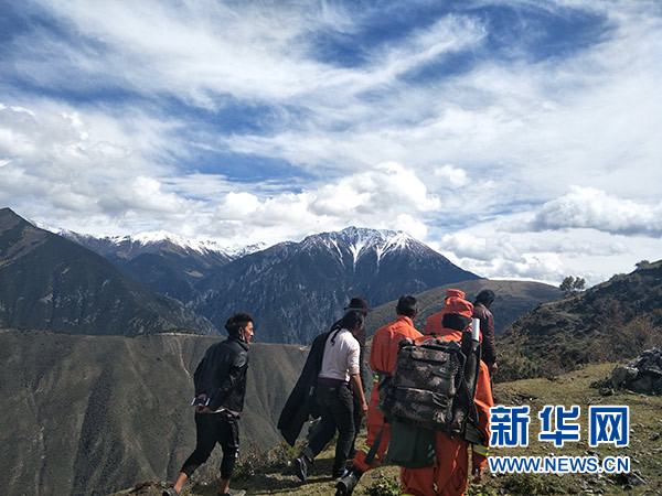 先遣隊員在波公村勘察地質災害情況(10月12日攝)。 新華社發(夏能 攝)