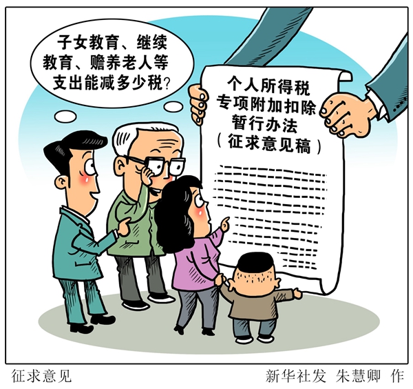 新華社北京10月20日電(記者 韓潔、劉紅霞)新一輪個人所得稅改革的一大亮點——專項附加扣除政策20日揭開面紗。當天起,財政部、國家稅務總局會同有關部門起草的《個人所得稅專項附加扣除暫行辦法(征求意見稿)》在兩部門官網開始為期兩周的向全社會公開征求意見。