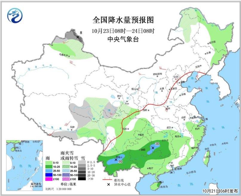 10月21日08時至22日08時,新疆塔城和阿勒泰地區、內蒙古東部、青海南部、西藏東部、川西高原北部等地的部分地區有小到中雪或雨夾雪,其中阿勒泰北部局地有大雪。江南中西部、華南西部和北部、海南島中東部等地有中到大雨,其中廣西中部和南部沿海、海南島東南部等地的局部地區有暴雨(50~70毫米)。內蒙古西部、甘肅中部有4~5級偏北風(見圖1)。