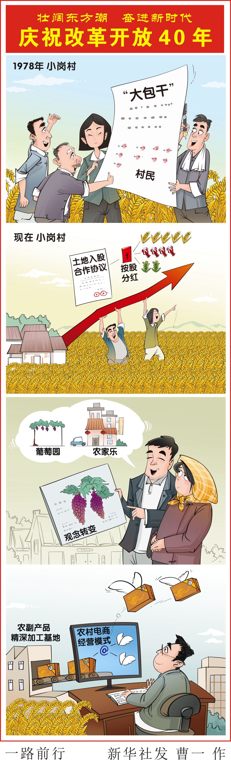 1978年的小崗村,18位村民按下了分田到戶的紅手印,“大包干”拉開了中國農(nóng)村改革的大幕。40年后的小崗村,正在開展農(nóng)村集體產(chǎn)權(quán)制度改革,土地入股讓農(nóng)民變股東;葡萄園里開起了農(nóng)家樂,對農(nóng)副產(chǎn)品進行精深加工,電商經(jīng)營模式助力產(chǎn)品打開銷路,觀念的轉(zhuǎn)變讓小崗村里的農(nóng)民不再僅僅種著一畝三分地。