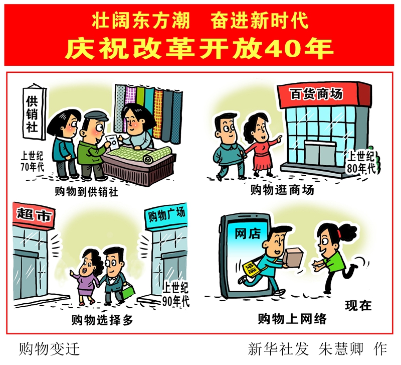 消費:上世紀70年代,購物到供銷社;上世紀80年代,購物逛商場;上世紀90年代,購物選擇多;如今,購物上網(wǎng)絡(luò)。↓↓