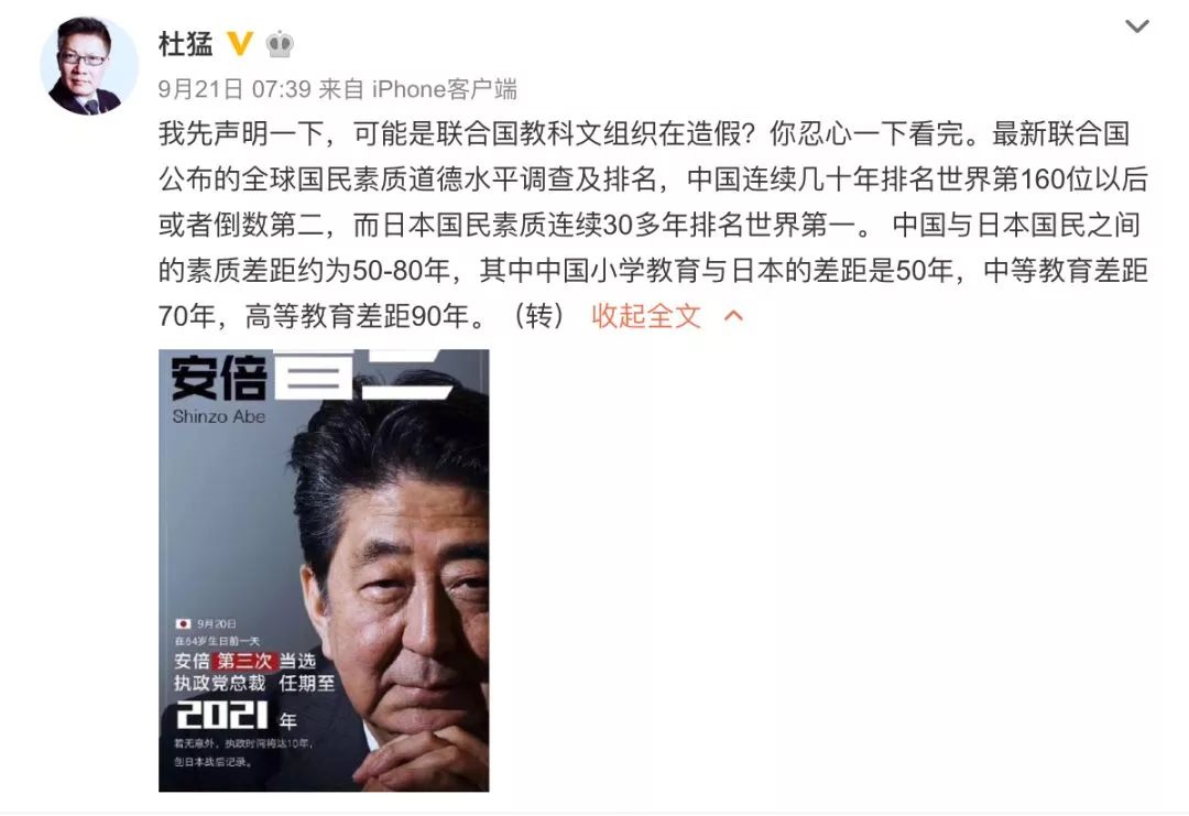 2018年9月21日,擁有近220萬粉絲的大V“杜猛”一大清早就發布了一條微博:“最新聯合國公布的全球國民素質道德水平調查及排名,中國連續幾十年排名世界第160位以后或者倒數第二,而日本國民素質連續30多年排名世界第一。中國與日本國民之間的素質差距約為50-80年,其中中國小學教育與日本的差距是50年,中等教育差距70年,高等教育差距90年?!彼m然在微博的最后加了個括號寫了個“轉”字,但并未寫明來源。配圖內容是:前一天,安倍晉三第三次當選日本執政黨總裁。