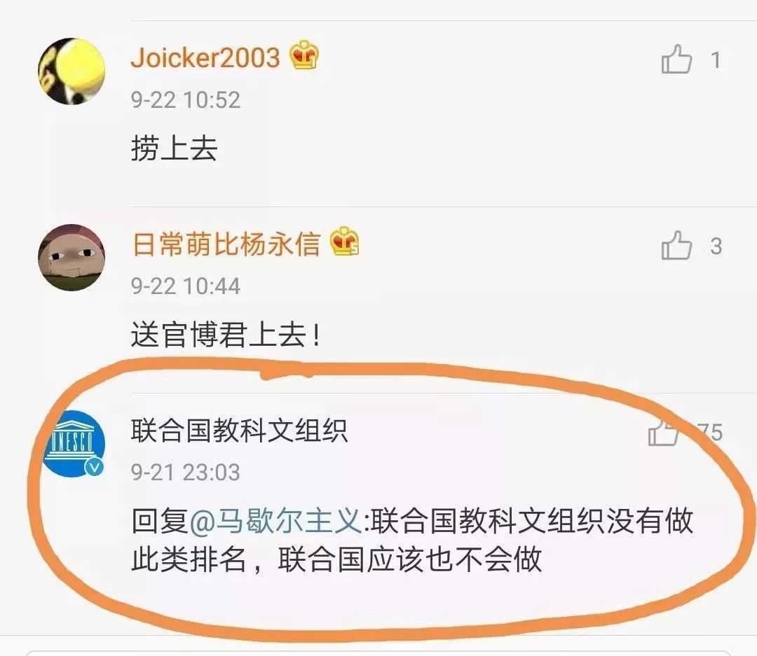 諷刺的是,“杜猛”還在微博最開始加了句“我先聲明一下,可能是聯合國教科文組織在造假?你忍心一下看完?!苯Y果聯合國教科文組織的官方微博當天就出來“強力打臉”,聲明“聯合國教科文組織沒有做此類排名,聯合國應該也不會做。”這條微博被多名網友舉報,微博管理方最后對其做了“不實”的標記,對博主禁言15天,但這條假消息并未被刪,仍然掛在那里,甚是刺眼。而作者在被處理前還接著轉發了好幾條貶低中國的評論。