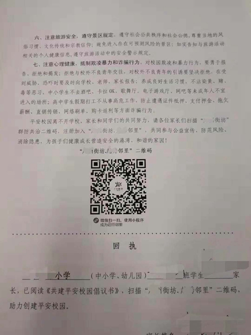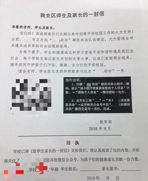 前不久,廣東某地發(fā)起“街坊群防共治隊(duì)伍建設(shè)”,并開(kāi)設(shè)了微信公眾號(hào)。當(dāng)?shù)亟逃忠浴吨氯珔^(qū)師生及家長(zhǎng)的一封信》的形式,要求師生和家長(zhǎng)關(guān)注其公眾號(hào),并要求學(xué)生及家長(zhǎng)簽名承諾“關(guān)注”。