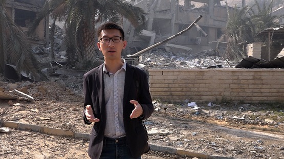 2018年4月14日,鄭一晗在大馬士革東北部的科研中心遭襲現場直播出鏡。