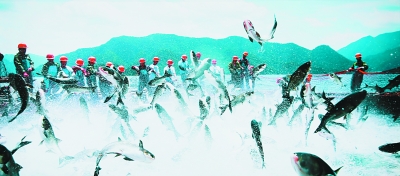 企業與地方聯合發展生態綠色經濟,在千島湖創新發展“保水漁業”,使當地的綠水青山變成了金山銀山。圖為千島湖巨網捕魚的壯觀景象。(資料圖片)