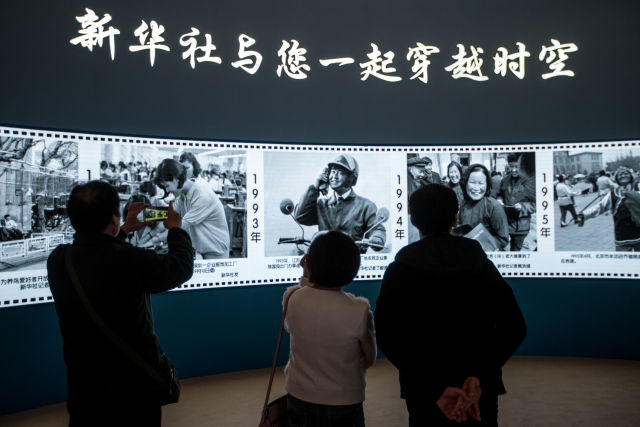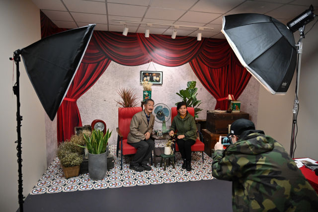 兩名參觀者在“時(shí)光博物館”里的年代照相館拍照留念。