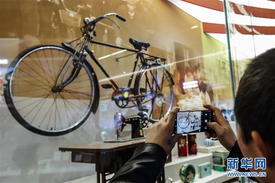在“歷史巨變”展區,一名參觀者在拍攝老式自行車和縫紉機。新華社記者沈伯韓 攝