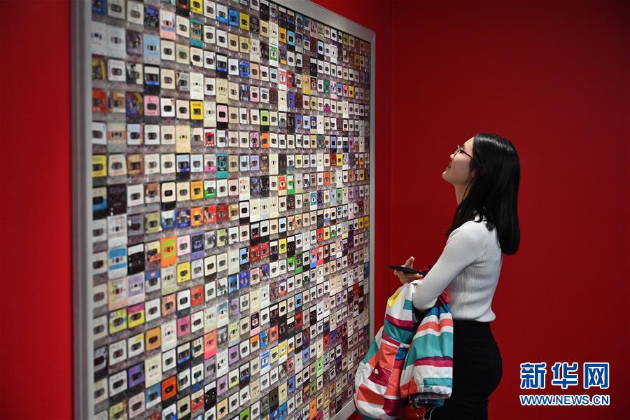 一名參觀者在“時光博物館”里觀看懷舊磁帶墻。 新華社記者李鑫 攝