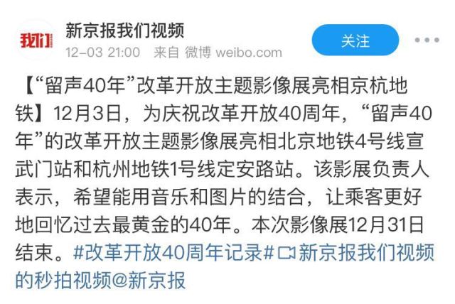 新華社北京12月4日電(記者 牧小湘)為慶祝改革開放40周年,新華社客戶端與網易云音樂、京港地鐵聯合舉辦的“留聲40年:那些改變你我的故事”音樂主題影像展12月3日亮相北京地鐵4號線宣武門站及杭州地鐵1號線定安路站。