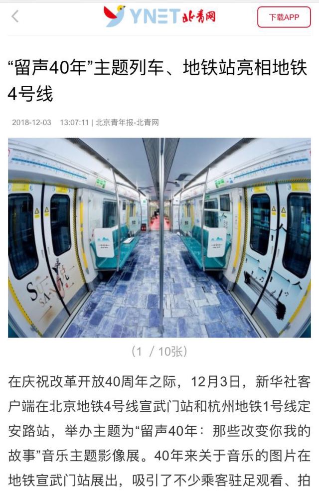 騰訊新聞客戶端、騰訊視頻,搜狐視頻以及新京報“我們視頻”等對影像展進行了專題報道及視頻推送。《北京晚報》頭版展示了本次影像展,并大篇幅介紹了“留聲40年”音樂車廂的情況。北青網聯合“北京頭條”App在影像展當天推出了多張圖片報道。今日頭條、觀媒等媒體機構制作的影像展小視頻和公眾號推文在各大網站和朋友圈廣泛傳播,為“留聲40年”影像展營造了濃厚的輿論氛圍。