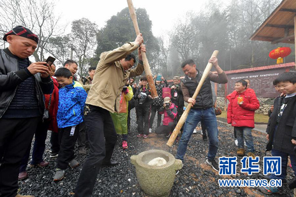 在江西宜春溫湯鎮水口村,游客體驗傳統的打糍粑(3月2日攝)。? 新華社記者 彭昭之 攝