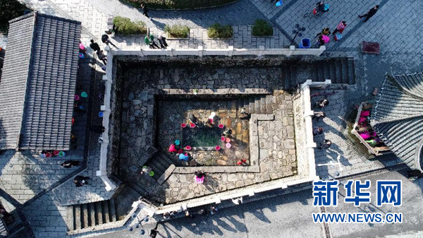 人們在江西宜春溫湯鎮的溫泉泉眼邊打水(2月28日無人機拍攝)。? 新華社記者 彭昭之 攝